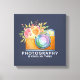 Una huella de lienzo con el dicho: La fotografía es como mi cosa. Diseñado con un ilustracion acuarela de una cámara naranja y un ramo de flores sobre la parte superior. Las flores del ramo son rosa claro y naranja con hojas verdes, un arreglo floral bonito.