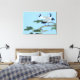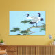 Esta Grulla Rojo Crowned tiene dos grúas en un árbol con un cielo azul en el fondo cada grúa tiene un pecho blanco y plumas grises azules paradas en la rama del árbol con agujas de pino verde y un cielo azul claro. Esta es una hermosa foto. en esta Canva envuelta