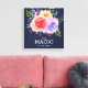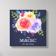 Una impresión de lienzo con el texto inspirador: La magia está en ti. Diseñado con un bonito ramo de rosas acuáticos con estribos, hojas y ramas, todo ello en un marco floral colorido. Fondo azul marino.