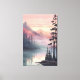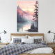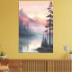 Esta serena obra de arte paisajística capta al amanecer una neblina escena de un lago montañoso, con tonos rosas suaves y naranjas pintando el cielo. Los pinos de alto tamaño reflejan el agua tranquila, creando un ambiente tranquilo y de ensueño perfecto para la meditación, los amantes de la naturaleza o la tranquila decoración de las paredes.