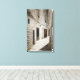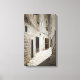 Tinta de tela de la lavandería compuesta de mantas blancas colgadas para secarse al sol en la fachada de una casa de piedra blanca en una callejuela con escaleras de piedra arenisca en una ciudad de Italia, creando una típica vista de la calle italiana/mediterránea. ¡Una gran decoración en la pared!