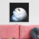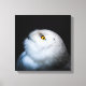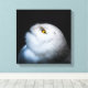 Fotografía de retrato de una hermosa lechuza nevada blanca con ojos amarillos sobre fondo negro.