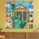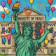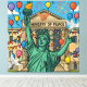 Un poderoso diseño satírico : La Estatua de la Libertad celebra alegremente frente al gran Ministerio de Paz, rodeado de globos, fuegos artificiales y decoraciones festivas. Esta audaz obra de arte al estilo personalizado contrasta el optimismo con la cruda verdad, mezclando humor, simbolismo y comentarios políticos. Perfecto para prendas de vestir, posters, tazas y otros objetos POD para los amantes del arte expresivo y que invita a la reflexión.