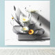 Eine moderne Komposition aus floraler Klarheit und grafischer Spannung: Weiße und gelbe Blüten entfalten sich in einem rechteckigen Gefäß, begleitet von feinen schwarzen Linien, die Blätter und Bewegung andeuten. Der Hintergrund bleibt ruhig und strukturiert, mit subtilen Schatten und geometrischen Akzenten. Die Szene verbindet florale Leichtigkeit mit architektonischer Präzision – ideal für Räume mit Sinn für Design und Tiefe.
