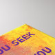 Diseño de texto de tipografía. Inspiradora cita motivacional del antiguo poeta persa, Rumi. Con las palabras: Lo que buscas es buscarte. El fondo es una pintura creativa y única acrílica abstracta con un amarillo brillante y soleado que contrasta con un naranja rústico y verduras moteadas, todo mezclado y mezclado para crear una pieza interesante.