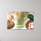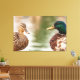 La imagen muestra dos patos mallard enfrentados. El pato de la izquierda es una hembra, con plumas marrones y beige, mientras que el pato de la derecha es un macho, con una cabeza verde distintiva y un pico amarillo. Ambos patos tienen un fondo borroso, sugiriendo que están cerca de un cuerpo de agua.