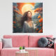 captures a serene woman with flowing brown hair, eyes closed in bliss, standing amid an autumnal dreamscape. A massive full moon glows orange behind her, surrounded by misty blue skies, fiery orange maple trees, rugged mountains, a winding river, and vibrant orange flowers dotting lush green fields-evoking magic, peace, and nature's embrace for a captivating bedroom or living room