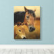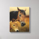 Una hermosa madre de caballo mira con cariño a su bebé. La tranquila escena ecuestre tiene un telón de fondo mudo del pasto.