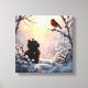 Un paisaje sereno de invierno con un gatito negro y un vibrante rojo ladrillo contra un fondo de follaje helado y copos de nieve suavemente caídos, evocando un sentido de magia y asombro en un estilo cinematográfico, épico que recuerda a cuadros clásicos de mate y al arte digital atmosférico.