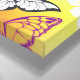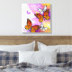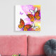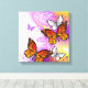 Naranja, mariposas monarcas detalladas sobre la luz, púrpura, pintoresco fondo pintado.