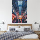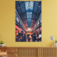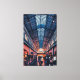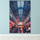 La imagen capta el interior del Ferry Building Marketplace, mostrando su grandeza arquitectónica. El techo alto cuenta con una compleja red de vigas de acero y paneles de vidrio que permiten que la luz natural inunde el espacio. La iluminación cálida y ambiente de las bombillas colgantes complementa la luz natural. La gente camina por el mercado, recorriendo las tiendas y los puestos que bordean los costados.