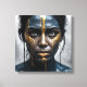 A woman's face, painted in deep blues and blacks, is dramatically accented with thick, dripping streaks of gold paint. Her expression is stoic and intense.