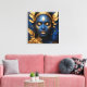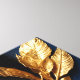 A serene portrait of a woman with dark blue skin adorned with gold leaf accents, resembling a crown and body ornamentation. Her eyes are closed, conveying a sense of peace or regal slumber.