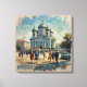 Discover Minsk's spiritual heart in this luminous impressionist masterpiece. The stunning Cathedral of St. Mary Magdalene dominates with its iconic turquoise and green domes crowned in golden crosses, rendered against swirling cream and blue skies. Elegant figures in vibrant vintage attire—crimson, sapphire, golden yellow dresses and tailored suits—stroll a sun-warmed plaza beside vintage automobiles in emerald and cream. Belle époque buildings frame the composition in warm pastels while lush foliage provides natural accents. Bold brushstrokes capture this Belarusian treasure where Orthodox spirituality, Soviet-era charm, and urban vitality converge in perfect harmony.