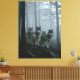 Four majestic gray wolves stand alert on a rocky, moss-covered ledge deep in a fog-shrouded evergreen forest, their piercing eyes cutting through the thick mist. Tall tree trunks fade into the ethereal haze, creating a dramatic and untamed wilderness scene full of quiet power and mystery. This atmospheric wildlife photograph captures the raw beauty of the wild, perfect for canvas prints, posters, throw pillows, phone cases, mugs, blankets, and décor that brings primal forest energy into any space.