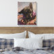 Mezcla adorable y pequeña mezcla de caniche pintada por Traci Van Wagoner poniendo un bronceado y una almohada roja con una oreja encaramada en la cabeza.