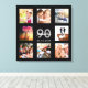 Un regalo de cumpleaños número 90 único, celebrando su vida con un collage de 8 de sus fotos. Añada imágenes de su familia, amigos, mascotas, pasatiempos o destino de viaje de ensueño. Personalice y agregue un nombre, edad 90 y fecha. Letras de color gris y blanco. Un fondo negro de moda. Este lienzo también está disponible en nuestra tienda con fondo de color blanco o rosa dorado.