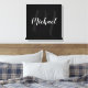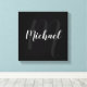 Regalo personalizado de Monograma y Nombre de Familia con nombre en estilo de fuente de escritura moderno en blanco y monograma en estilo de fuente de escritura moderno en gris como fondo sobre fondo negro.