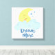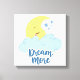 Anima dulces sueños con esta adorable y suave ilustración de "Sueña más". Con una luna creciente soñolienta y estrellas descansando en una nube suave y esponjosa, este diseño es perfecto para una guardería o el dormitorio de un niño. Es un recordatorio calmado y reconfortante para siempre dejar que tus sueños despeguen.
