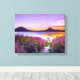 muelle de madera marrón entre el campo de flores de lavanda cerca del cuerpo del agua durante la hora dorada