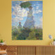 Mujer con Parasol - Madame Monet y su hijo de Claude Monet, óleo sobre lienzo de 1875, es un cuadro de una mujer con un vestido blanco y un paraguas sobre su cabeza sobre la cima de una colina cubierta de hierba y flores silvestres, retroiluminada contra un brillante cielo azul y nubes blancas. A su lado está un niño, Camille, hijo del artista. Pintada con trazos rápidamente aplicados de pintura exuberante de aceite, la imagen mira hacia arriba en la cima de la colina, mientras que el sujeto arroja una sombra profunda y fresca a través de la hierba de campo y flores. Los reflejos amarillos de las flores rebotan sobre el luminoso vestido blanco de la mujer. Monet evoca la luz, el color, la forma, la sombra y la atmósfera con golpes rápidos y decisivos de su pincel en la construcción de una inolvidable imagen de una mujer que camina en medio del mundo natural. Claude Monet (1840-1926) fue fundador y principal impulsor de la escuela de pintura impresionista francesa. Nacido en París, Monet estudió con Eugene Boudin, quien enseñó los fundamentos de la pintura al óleo y de la pintura al aire libre del caballete, y después con el pintor Charles Gleyre, y finalmente se hizo amigo de sus compañeros impresionistas Manet, Renoir, Bazille y otros. Rechazados por el Salón de París y otros recintos de la institución académica del siglo XIX, los impresionistas pintaron directamente de la naturaleza, capturando momentos fugaces en el tiempo con colores brillantes, rotos y pequeñas y rápidas pinceladas. Monet vivió y estudió en Londres y Holanda, produciendo muchas pinturas, hasta la primera exhibición impresionista en 1874, donde su pintura Impresión: Sunrise ganó notoriedad y le ganó al grupo su famoso apodo. Tras la muerte de su hijo y de su primera esposa, Camille, Monet se instaló en Giverny, donde el éxito creciente le permitió establecer una casa y un estudio rodeados de jardines elaborados. Monet pintó muchos paisajes, incluyendo escenas de jardín y su famosa serie de Catedral, con cada vez más preocupación por la luz, el color y la atmósfera, con una preocupación por el color y las formas que en su mayor edad bordeaban una especie de abstracción, convirtiéndolo en uno de los pintores más queridos de la era moderna.