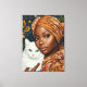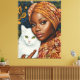 Un retrato cautivador de una joven africana con un velo vibrante, sosteniendo con suavidad un gato blanco, ambientado en un exuberante fondo botánico.