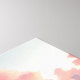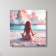 Mujer hermosa meditando en una playa de arena blanca y brillantes cristales de mar. Nubes esponjosas de color rosa y azul y agua azul pálido.