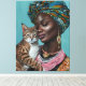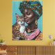 Colorida pintura de una mujer negra usando ropa y joyas con estampado africano. Agarrando a su hermoso gato