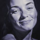 Mujeres "Brianna Blue" En El Carbón. El retrato captura a una joven con sorprendentes contrastes, su rostro iluminado por una luz brillante y aguda contra un fondo de sombra profunda. Su expresión, representada en carbón estilizado, es de sorpresa o curiosidad, añadiendo una intensidad dramática a la escena. La interacción de luz y oscuridad resalta los contornos de su rostro, creando un contraste vívido que realza el moderno y contemporáneo ambiente de las obras de arte, atrayendo al espectador a su momento de asombrosa revelación.