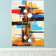 Eleva tu espacio de vida moderno con esta impresionante impresión en lienzo. Con una audaz composición abstracta inspirada en la mitad del siglo XX con líneas negras dinámicas, círculos blancos y salpicaduras vibrantes de naranja y azul. Esta sofisticada pieza de calidad de galería aporta un toque instantáneo de elegancia retrofuturista a cualquier habitación o oficina profesional.