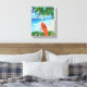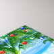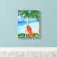 Felices vacaciones desde las cálidas playas de arena de su playa favorita de la isla tropical. Palmera decorada con adornos y luces de Navidad, con una tabla de surf retro inclinada contra el árbol de Navidad.