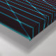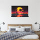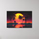 Silhouetted palm trees frame a massive glowing sun striped in retro orange and pink against a starry night sky. A luminous cyan grid stretches across the foreground, its perfect reflections shimmering on the water-like surface below. This iconic synthwave scene pulses with 80s nostalgia and futuristic tropical vibes, ideal for posters, canvas prints, phone cases, mousepads, throw pillows, and décor that brings bold vaporwave energy to any space.