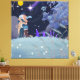 An illustration in a minimalist style depicting two people hugging on a grassy hill under the night sky. The warm yellow light from a streetlamp creates a cozy focal point, surrounded by purple flowers and tall grass. Above, the starry sky features flying birds and a streak of a shooting star, evoking a romantic and peaceful atmosphere. A canopy of light blue leaves completes the scene, adding a sense of tranquility and intimacy.