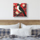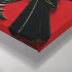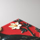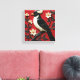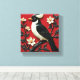 A square tile with a red background features a bird perched on a branch, surrounded by flowers and leaves. The bird has a black head and back, a white chest, and a distinctive white crest on its head. It has a yellow beak and a dark eye. The branch is dark brown, and the leaves are dark green. The flowers are white with yellow centers.
