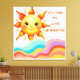 Arte de pared de onda retro groovy. El diseño muestra un sol sonriente amistoso que sale sobre una serie de coloridas ondas de arcoíris fluidas en un estilo caprichoso dibujado a mano.