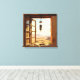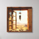 A rustic window with wood windchimes hanging looking out a desert canyon scene.