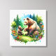 Un oso mami jugando con su bebe oso afuera en un campo de hierba y flores con un fondo de pino. Estilo acuarela ai art.