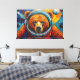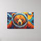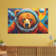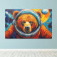 Esta impactante obra de arte de Otis Porritt presenta un majestuoso oso, su rostro enmarcado por el visor transparente del casco de un astronauta. Ricas pinceladas texturizadas en naranjas cálidos, rojos y marrones definen el pelaje del oso, contrastando bruscamente con los azules y púrpuras fríos y arremolinados del fondo cósmico. Planetas y estrellas distantes puntúan el vibrante espacio, representados con efectos dinámicos similares al impasto. La mirada directa del oso ancla la composición, creando una narrativa visual poderosa y atractiva dentro de este fantástico entorno celestial.