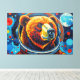 Esta sorprendente obra de arte de Otis Porritt presenta un oso con un casco de astronauta, su mirada directa y cautivadora. El pelaje del animal se representa con una rica tapicería de pinceladas texturadas en cálidos naranjas, amarillos y marrones, creando un efecto vibrante, casi impasto. Azules y púrpuras fríos definen el hocico, contrastando con los tonos ardientes del pelaje. La visera reflectante del casco enmarca la cara del oso, mientras que el fondo gira con pinceladas dinámicas de azul verde y azul profundo, evocando una extensión cósmica. El medio digital captura magistralmente una estética pictórica.