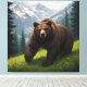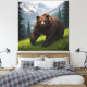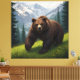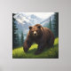 Un oso marrón fotografiado en un vibrante prado de montaña rodeado de vegetación exuberante y impresionantes cumbres nevadas bajo un cielo despejado.