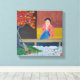 mujer en kimono sentada en tatami y siembra una colcha mientras disfruta de las vistas de las hojas de otoño en su patio jardín