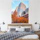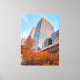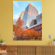 La imagen capta una vista de bajo ángulo de un rascacielos con una fachada de cristal que refleja el cielo azul y los edificios circundantes. El edificio está situado en medio de un conjunto de árboles con un follaje otoñal vibrante, hojas naranjas y rojas que contraen con la arquitectura moderna y elegante. El cielo de arriba es azul claro, con nubes espesas que le dan profundidad a la escena.