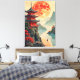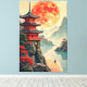 Una impresionante pagoda roja se sienta sobre acantilados rocosos bajo el resplandor de una enorme luna, rodeada de aguas serenas.
