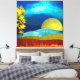 Un hermoso diseño de paisaje abstracto con un cielo único que se asemeja a las olas en líquido y una luna, montañas y un árbol dorado.