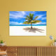 Esta foto muestra una palmera sola en una playa de arena blanca.