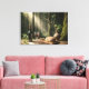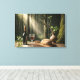 Una mesa rústica de madera situada en un bosque sereno acoge una botella de vino, un vaso y una hogaza de pan recién horneada.