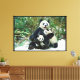 Un Panda con cubos. tiene un panda blanco y negro sentado con sus dos costillas con la vista del bosque detrás de él y los árboles que los rodean y la nieve en el suelo. Esta es una hermosa foto. En esta tela envuelta.