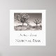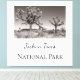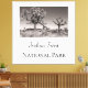 La imagen muestra una fotografía en blanco y negro de un paisaje desértico con dos prominentes árboles de Joshua. Los árboles están altos contra un cielo mudo, sus ramas se extienden en una variedad de direcciones. El primer plano está repleto de vegetación desértica baja, lo que crea una sensación de profundidad y textura.