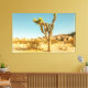 Un árbol de Joshua se alza de forma prominente en un paisaje desértico bajo un cielo azul claro. El árbol tiene un tronco grueso, texturado y una follaje verde espinoso en los extremos de sus ramas. El suelo es de arena y está salpicado de arbustos bajos. En el fondo, hay formaciones rocosas y una pequeña colina que le dan profundidad a la escena.