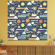 Patrón tropical vibrante con soles, olas, palmeras, montañas y veleros sobre un fondo oscuro. Perfecto para los diseños de verano.